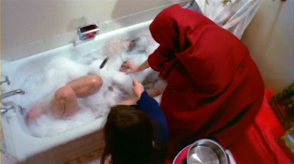 The kids find the lodge and break into the wine cellar. Following their trail through the snow, the doctor finds them, only to be dispatched in a gratuitous slow motion, sepia-toned scene of slaughter that drags out for over 2 minutes. Meanwhile, around that same time, Lovely is trying to bed Ralph, who misses every single hint, no matter how blunt. But when Julie walks in on this stunted attempt at seduction, she and Lovely have an argument that quickly devolves into one of the tamest “cat fights” to come out of ’70s cinema.