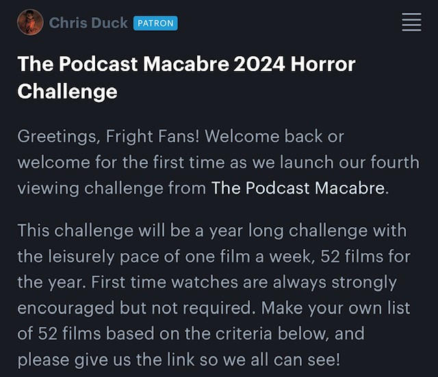 Are you up for a challenge? Then listen in and sign up for The Podcast Macabre 2026 Horror Challenge on Letterboxd! Join us as we share all of the criteria for next year’s viewing challenge.